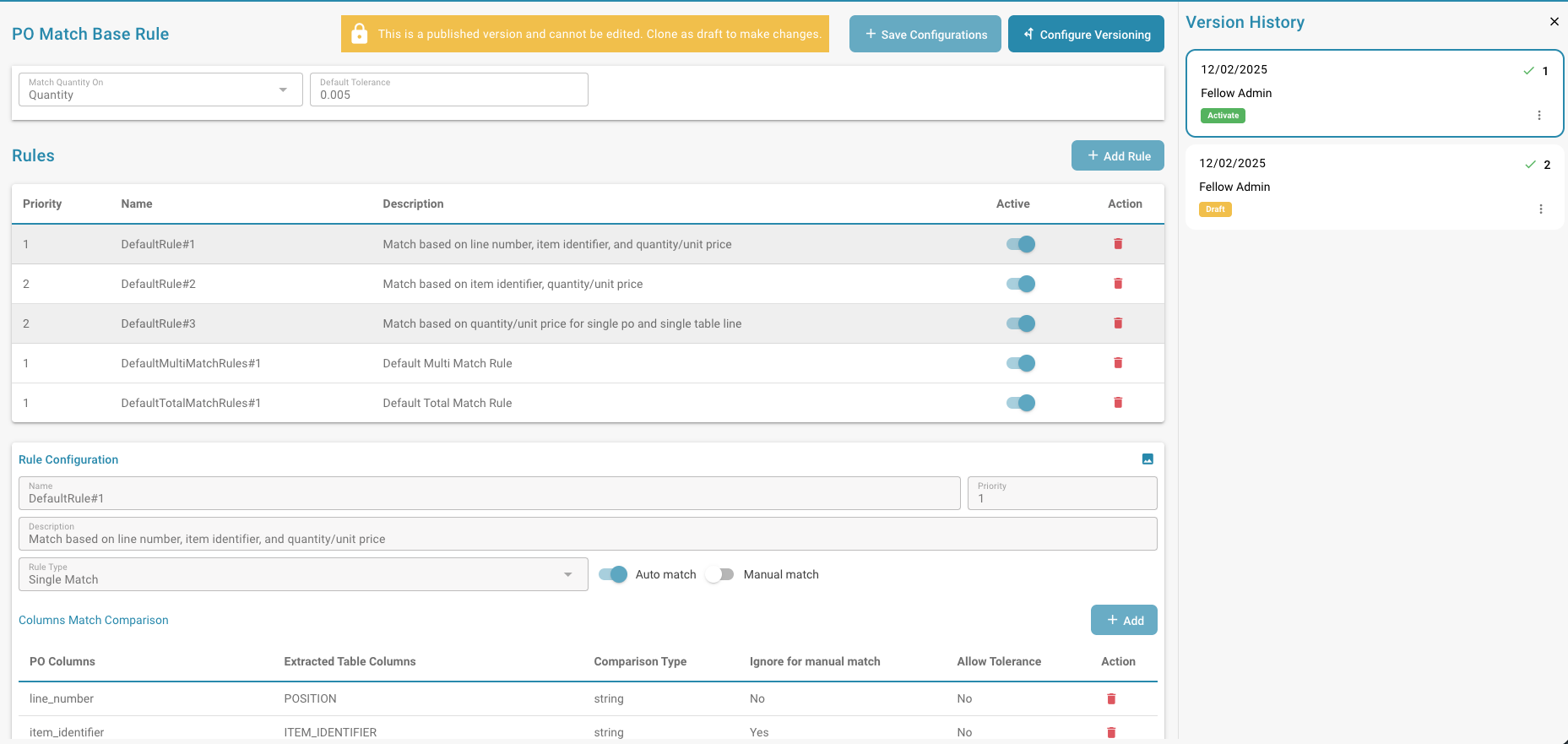 Personalización mejorada de reglas de coincidencia de OC: DocBits ahora proporciona un control más granular y personalizable sobre las reglas de coincidencia de órdenes de compra. Los administradores pueden configurar con precisión qué columnas deben evaluarse durante el proceso de coincidencia para cada tipo de documento, asegurando que solo se consideren los campos más relevantes. Además, se pueden definir tolerancias a nivel de columna, lo que permite una mayor flexibilidad al manejar discrepancias menores. Cada regla también puede configurarse para aplicarse a la coincidencia manual, la coincidencia automática o ambas, brindando a los equipos la capacidad de adaptar el flujo de trabajo de coincidencia a sus requisitos operativos exactos. Estas mejoras mejoran significativamente la adaptabilidad y precisión del proceso de coincidencia de órdenes de compra.