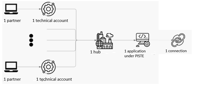 The hub provides its customers with a web or application solution to enable them to make the various API calls. **It is thus the hub that makes API calls on behalf of all its customers**. In this case, each partner must have a technical account, but only the hub needs an application under PISTE and a connection to the PPF.