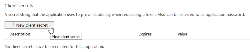 Na tela Certificates & secrets, clique no botão + New client secret na seção Client secrets: