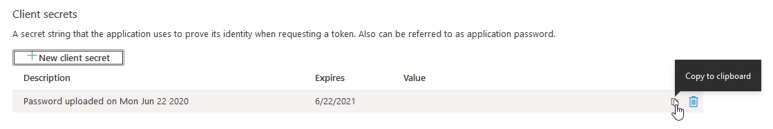 Nota: Selecione esta data de expiração de acordo com a política da sua empresa. Uma vez expirado, um novo client secret precisará ser criado e especificado para cada configuração de e-mail onde foi usado anteriormente.