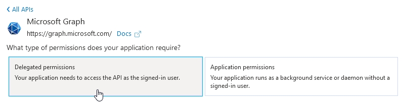 Das duas subcategorias, selecione Delegated permissions.