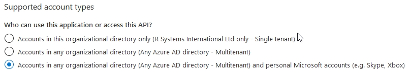 Accounts in any organizational directory (Any Azure AD directory Multitenant) and personal Microsoft accounts (e.g. Skype, Xbox)
