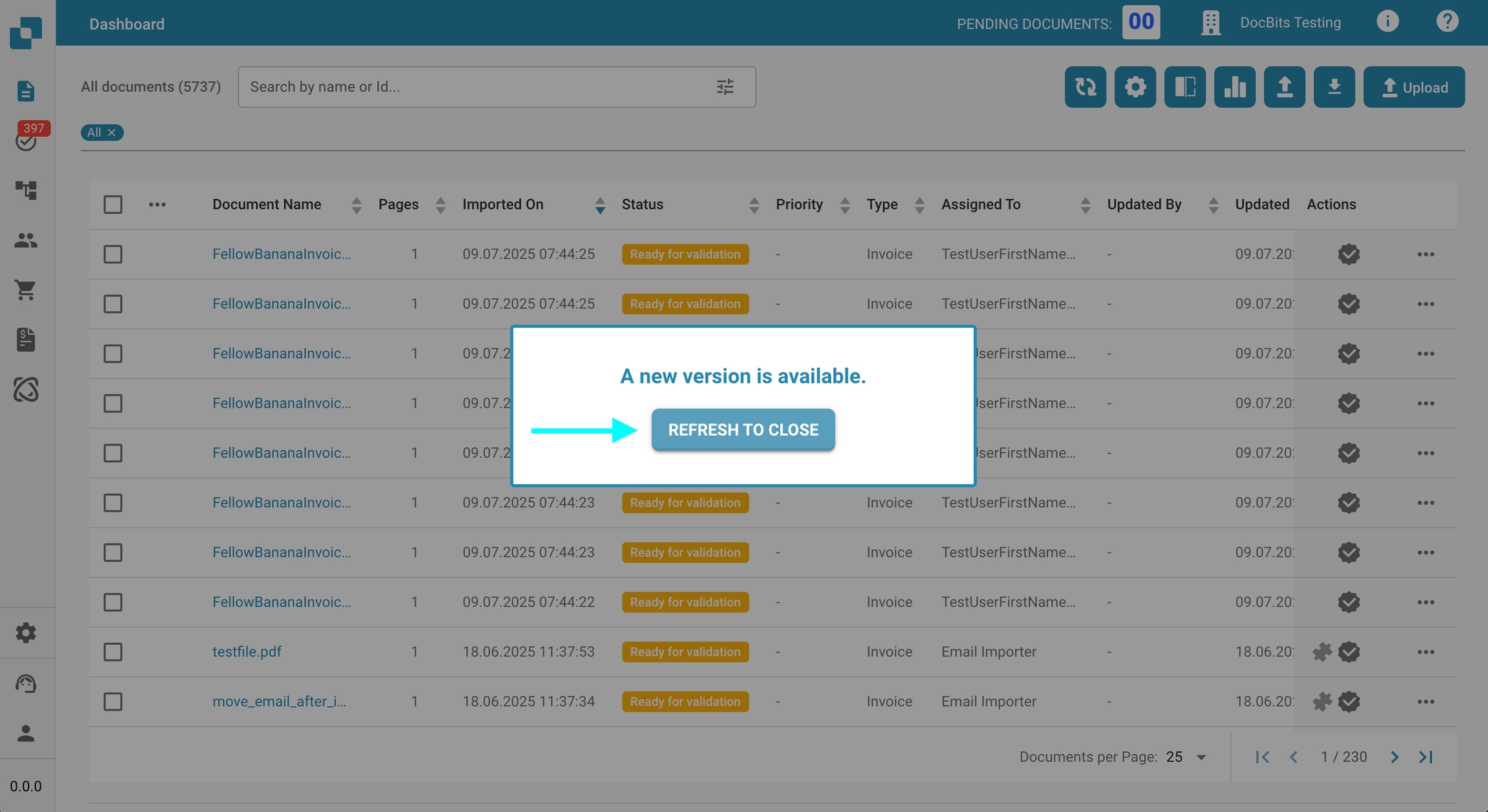 Clique em Atualizar para fechar na janela de diálogo. DocBits será recarregado e aberto com a versão mais recente. Isso garante que os usuários estejam sempre trabalhando com os recursos, melhorias e correções de bugs mais recentes.