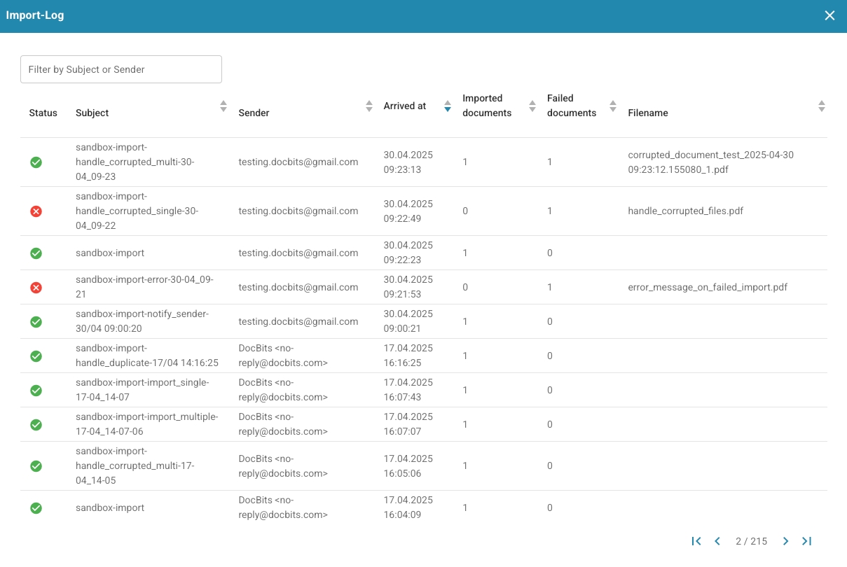 Use este botão para abrir uma tabela exibindo todos os documentos importados recentemente via e-mail, juntamente com informações relevantes para cada um.