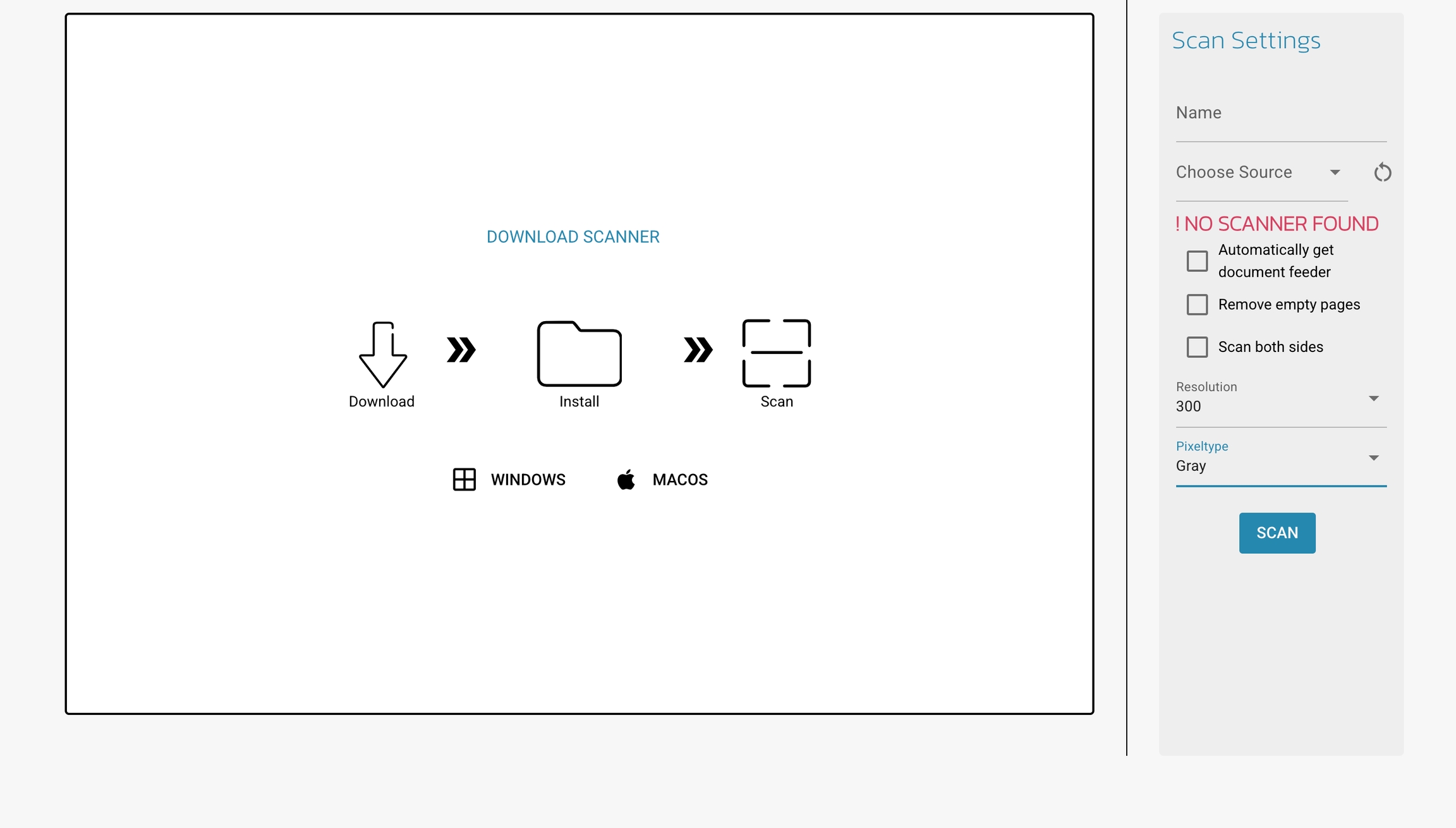 Para usar este recurso, você precisa ter um scanner conectado ao seu sistema. Se um scanner estiver disponível, você pode selecioná-lo à direita, nomear seu documento e clicar em Digitalizar. Opcionalmente, você pode ajustar as configurações de digitalização à direita antes de iniciar o processo.