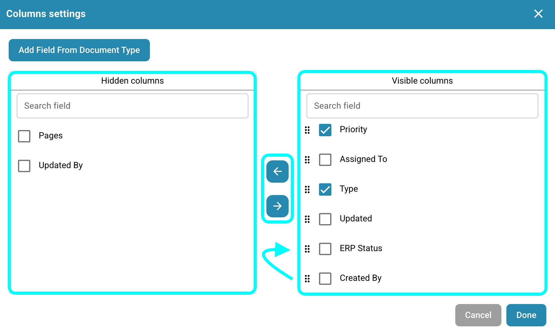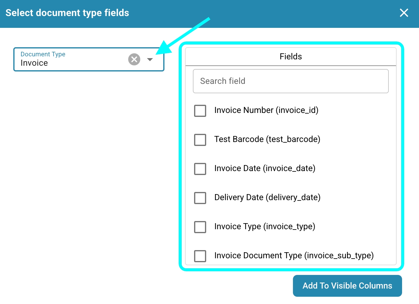 Você também tem a opção de adicionar colunas adicionais a partir de campos específicos de tipos de documento específicos para personalizar a visualização do seu painel. Para isso, basta clicar em Adicionar campo do tipo de documento.