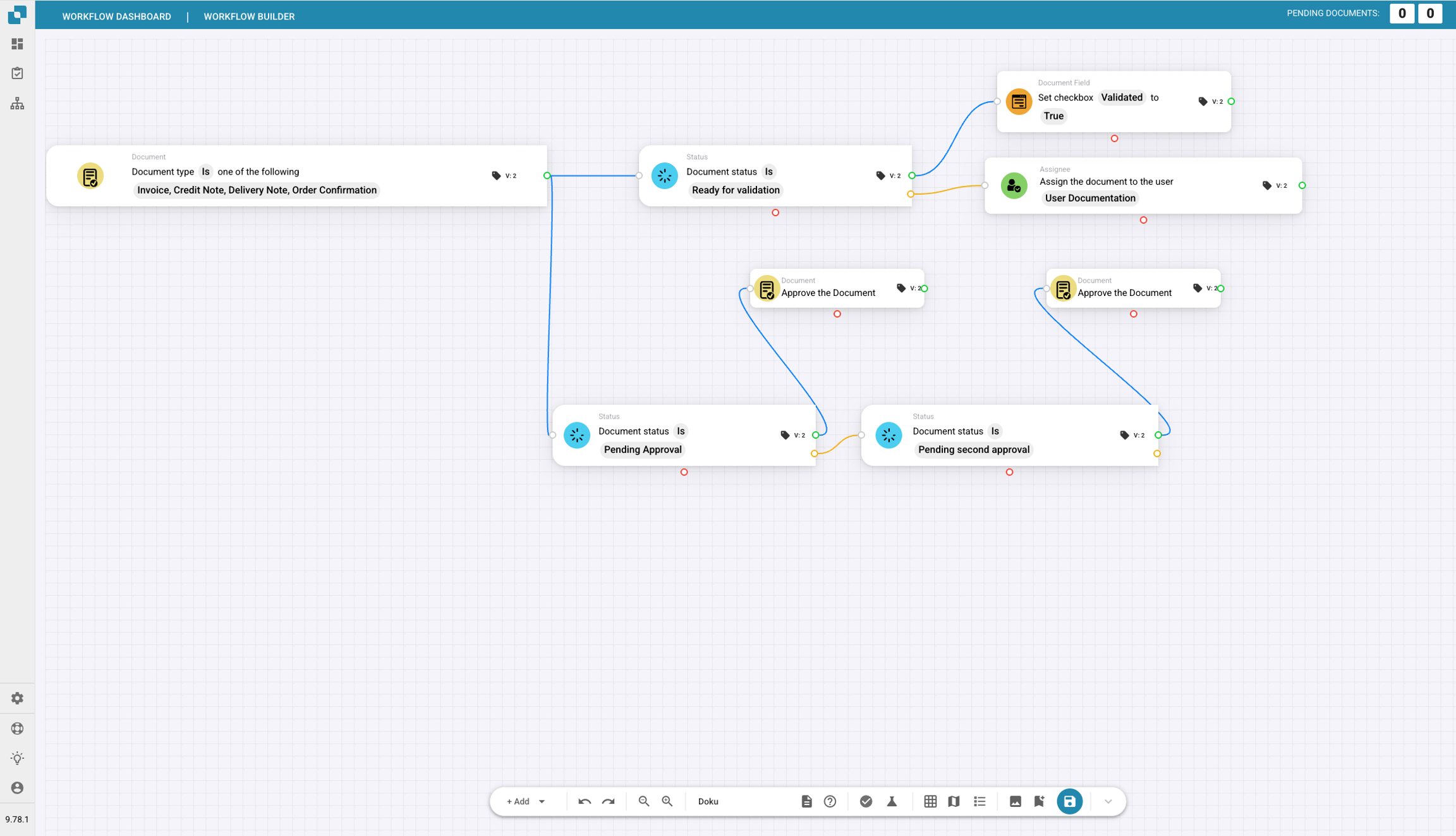 Advanced Workflow Designer: O DocBits apresenta um Advanced Workflow Designer completamente novo — um construtor de automação visual baseado em nós que coloca a orquestração completa de fluxos de trabalho ao alcance das suas mãos. Usando uma tela intuitiva de arrastar e soltar, os administradores podem conectar cartões de fluxo de trabalho do DocBits em pipelines de processamento complexos e de múltiplas etapas. Cada nó na tela representa uma ação ou ponto de decisão, e as conexões entre os nós definem o fluxo dos documentos através do pipeline. O designer suporta etapas de espera para introduzir atrasos temporizados, caminhos paralelos onde todos ou alguns ramos devem ser concluídos antes de continuar, e a capacidade de encadear qualquer combinação de cartões integrados ou criados por parceiros. Os fluxos de trabalho podem ser salvos como modelos reutilizáveis, importados e exportados entre ambientes, e testados diretamente a partir do designer antes de entrar em produção. O editor possui uma tela com snap-to-grid e navegação por mini-mapa para fluxos de trabalho grandes, atalhos de teclado para copiar e colar, validação em tempo real com destaque de erros durante a construção, e proteção contra edição concorrente para evitar a sobrescrita de alterações por outros utilizadores. Registos de execução detalhados fornecem monitorização por nó, permitindo aos administradores rastrear exatamente como cada etapa de um fluxo de trabalho foi executada e onde ocorreram problemas.