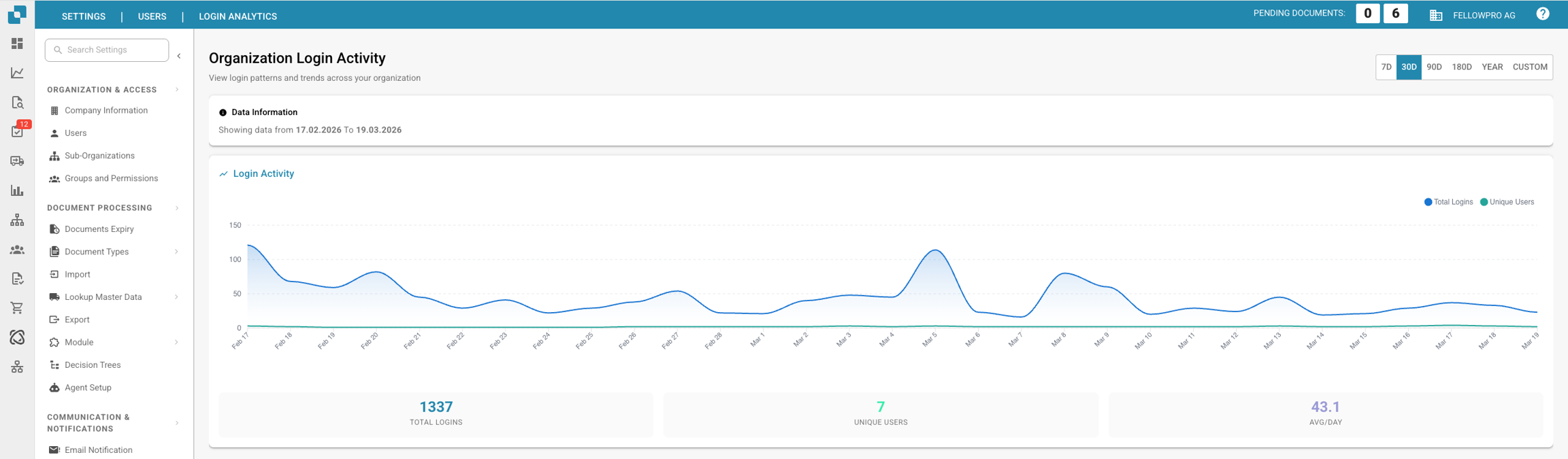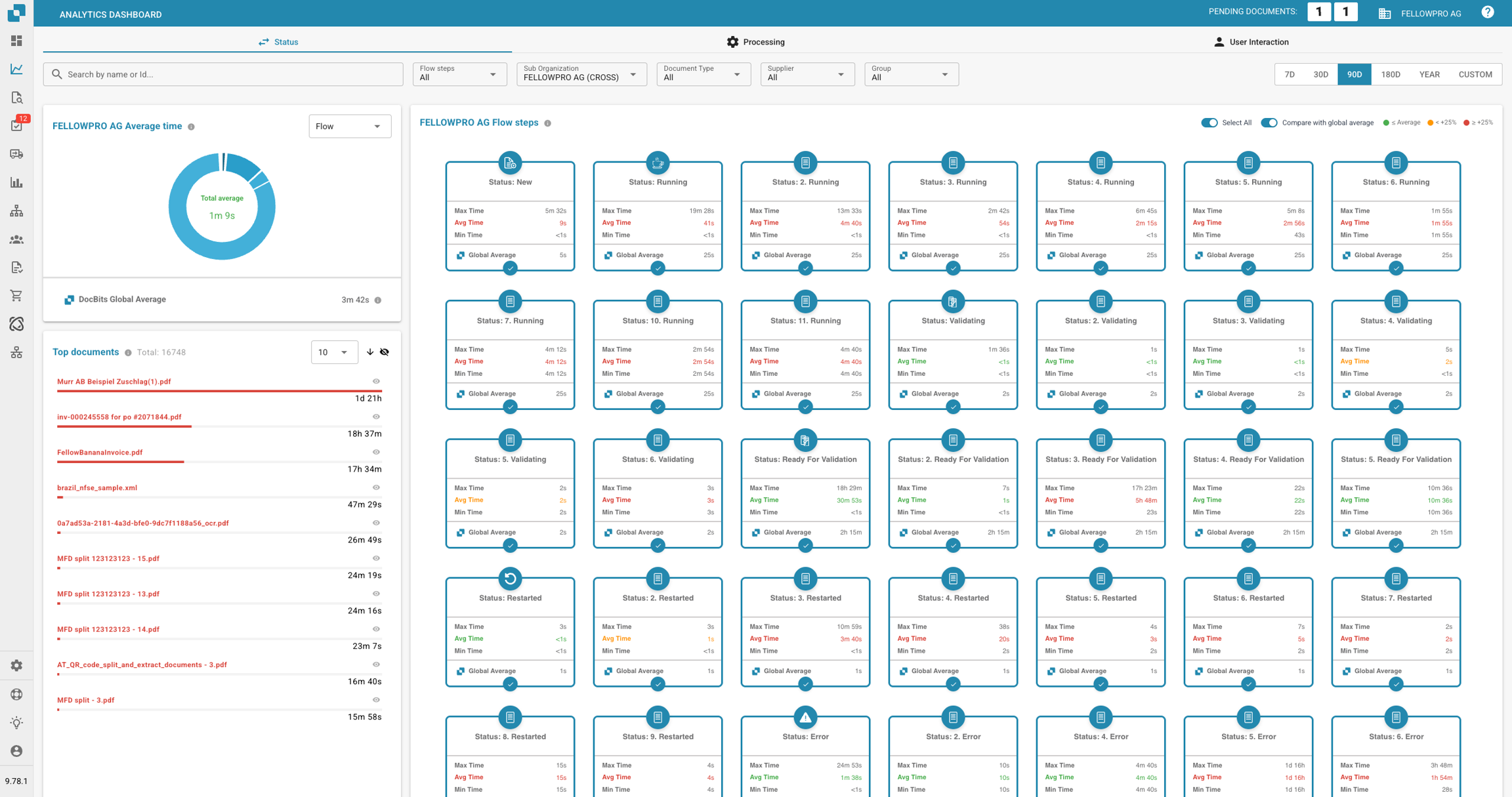 Analytics Dashboard: Um módulo abrangente de análise de processamento de documentos foi introduzido com múltiplas vistas de painel incluindo Executive Overview, API Metrics, Quality Metrics e Processing Performance. Document Flow Analytics oferece métricas ao nível da organização sobre tempos de processamento de documentos e transições de estado. Um sistema completo de Activity Log e Event Log permite que os administradores naveguem, pesquisem, filtrem e exportem dados de eventos com visualizações de gráficos e destaque de sintaxe JSON. Uma funcionalidade de Audit Trail fornece rastreamento detalhado do histórico de alterações com detalhes em popup para cada modificação.