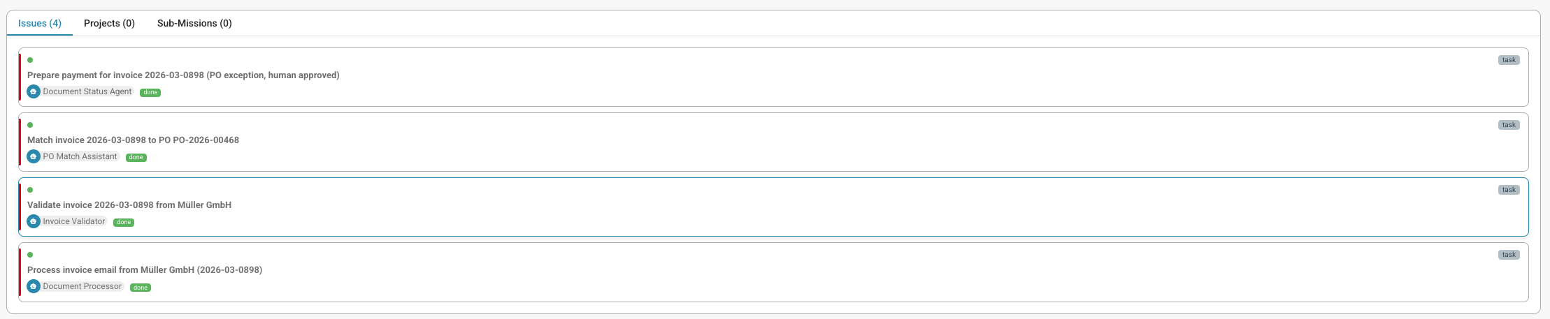 DocNet AI Agents: O DocBits agora inclui DocNet AI Agents — agentes inteligentes e autónomos que funcionam em segundo plano para lidar com tarefas de processamento de documentos como a correspondência de ordens de compra e a validação de faturas. Os agentes operam de forma independente, trabalhando nas tarefas atribuídas e escalando para os utilizadores apenas quando é necessário julgamento humano. Quando um agente encontra uma exceção ou requer confirmação, cria um pedido de aprovação que aparece diretamente na caixa de entrada do utilizador, garantindo que nada é perdido sem necessitar de supervisão constante. Os agentes podem coordenar-se entre si, delegar sub-tarefas e organizar o trabalho em missões e projetos para processos complexos de múltiplas etapas. Um painel dedicado de agentes fornece visibilidade completa sobre a atividade dos agentes, métricas de desempenho e registos de auditoria, para que os administradores possam monitorizar o que os agentes estão a fazer e quão eficientemente trabalham. Notificações em tempo real mantêm os utilizadores informados quando os agentes concluem tarefas ou sinalizam itens para revisão.