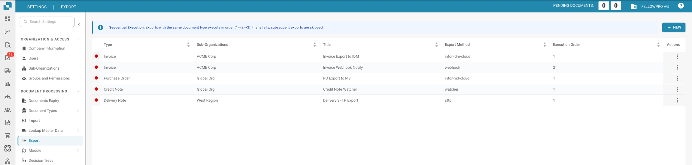 Melhorias na Exportação: As configurações de exportação agora suportam ordenação de execução, permitindo aos administradores definir a sequência em que múltiplos métodos de exportação são processados. Um novo botão de re-exportação nas telas de erro permite que os utilizadores tentem novamente a partir da etapa que falhou em vez de reiniciar todo o processo. O DocBits também agora suporta o alvo de exportação API GLS840MI, com uma interface atualizada para gerir múltiplas configurações de exportação ativas por tipo de documento.