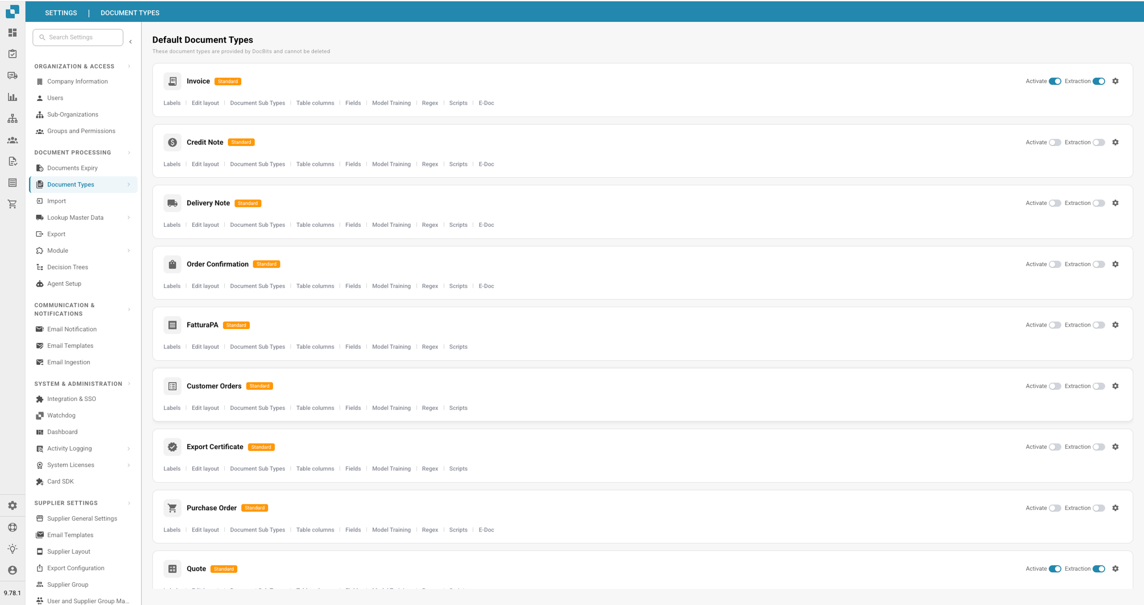 Expansão de formatos E-Invoice: O DocBits expandiu significativamente o seu suporte de formatos de fatura eletrónica com mais de 80 novos tipos globais de e-invoice e mais de 40 novos formatos. Os formatos recentemente suportados incluem Taiwan EGUI, Thailand E-Tax, India GST Credit Note, SPS Commerce RSX 7.7.4, XRechnung 3.0.2, ZUGFeRD 2.2 e 2.3.2, variantes Factur-X, Uruguay CFE, Ecuador SRI Retención, SVEFAKTURA 1.0, EHF 3.0, OIOUBL, Finvoice e Asia-Pacific PINT Credit Notes, entre outros. O DocBits agora atinge 100% de cobertura de classificação e extração para todos os formatos de documentos eletrónicos suportados.